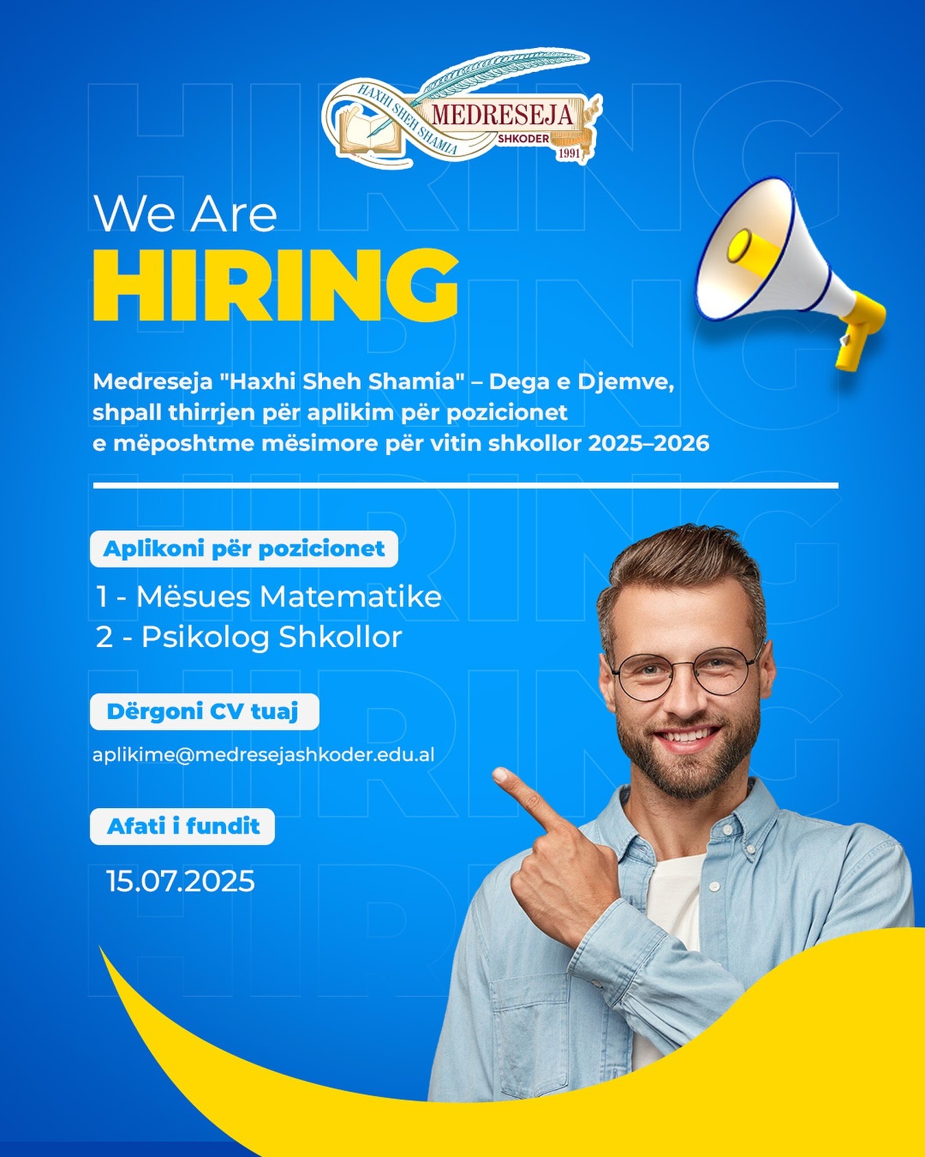 Medreseja e Shkodrës “Haxhi Sheh Shamia” Dega Djem ka hapur aplikimet për pozicionin Mësues Matematike dhe Psikolog Shkollor.
